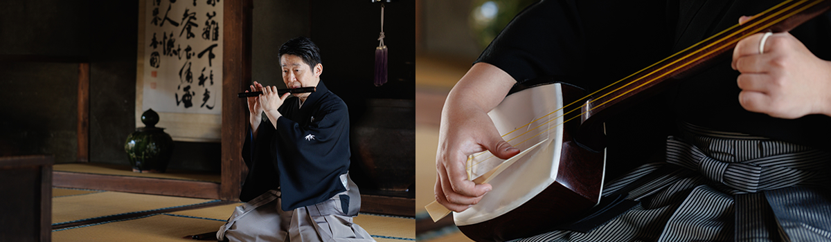 笛の音色ともに日本伝統楽器、長唄三味線、小鼓などの日本伝統楽器が織りなす演奏のご依頼を承っております。