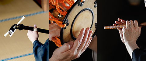篠笛、能管、長唄三味線、小鼓、大鼓、締太鼓